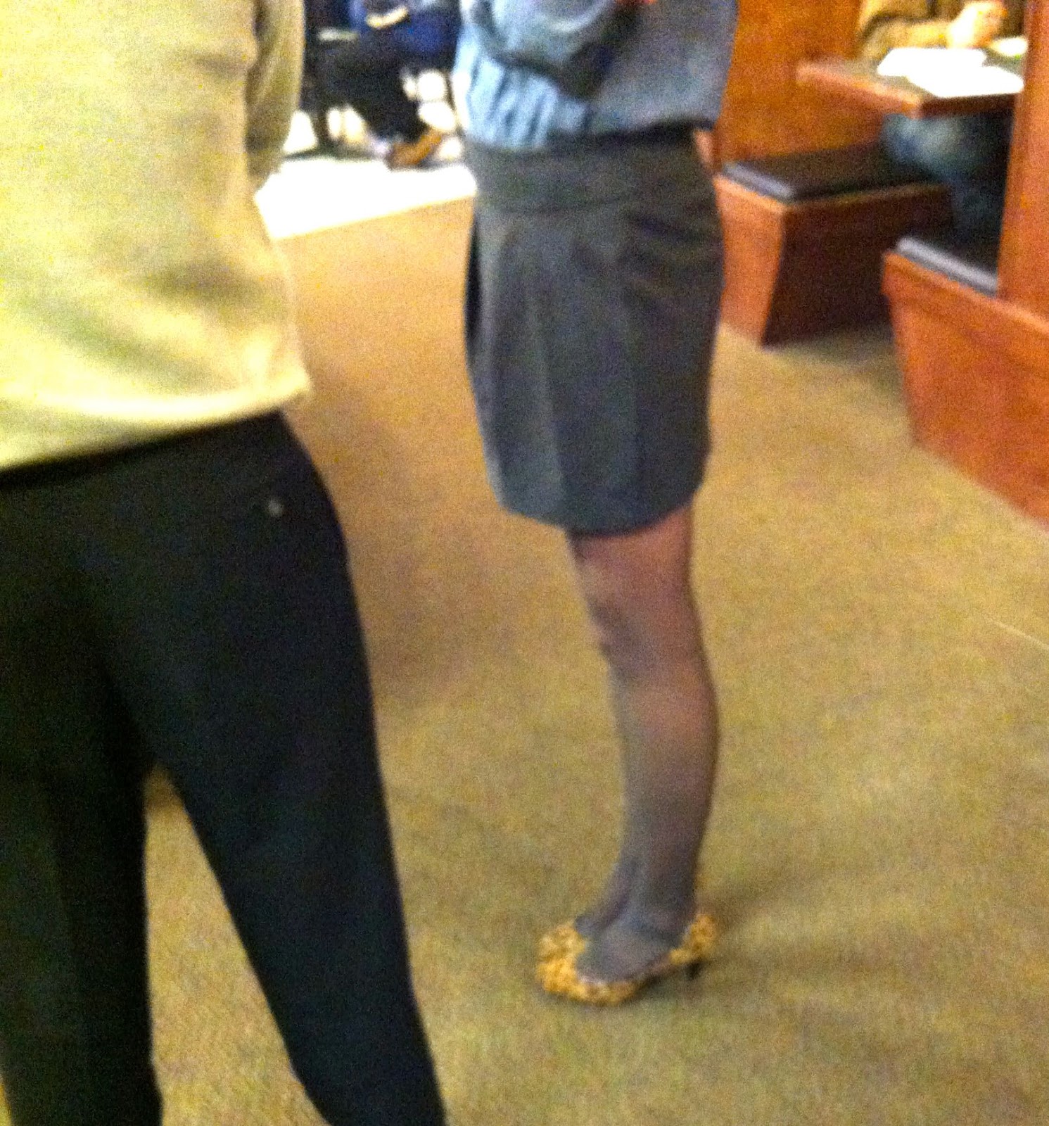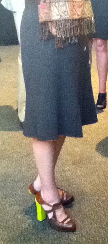 Grey tights as these are should NEVER be paired with anything other than a simple neutral shoe. I love these shoes, but NOT the hosiery. Grey and leopard should never go together unless I’ve found myself reincarnated as a leopard myself and then and only then is it acceptable for a leopard to go grey; and by grey, I don’t mean 50 Shades, unless it refers to the fact I’ve stopped dying my hair! (GASP!) Basically the reason this doesn’t work is I found myself staring at the yellow leopard shoes that were paired with an overall quietly neutral gray and blue business casual outfit. If these shoes had been blue suede or black with a bit of bling, I would have left her and her shoes alone. But alas, I cannot dear reader and remain true to you.